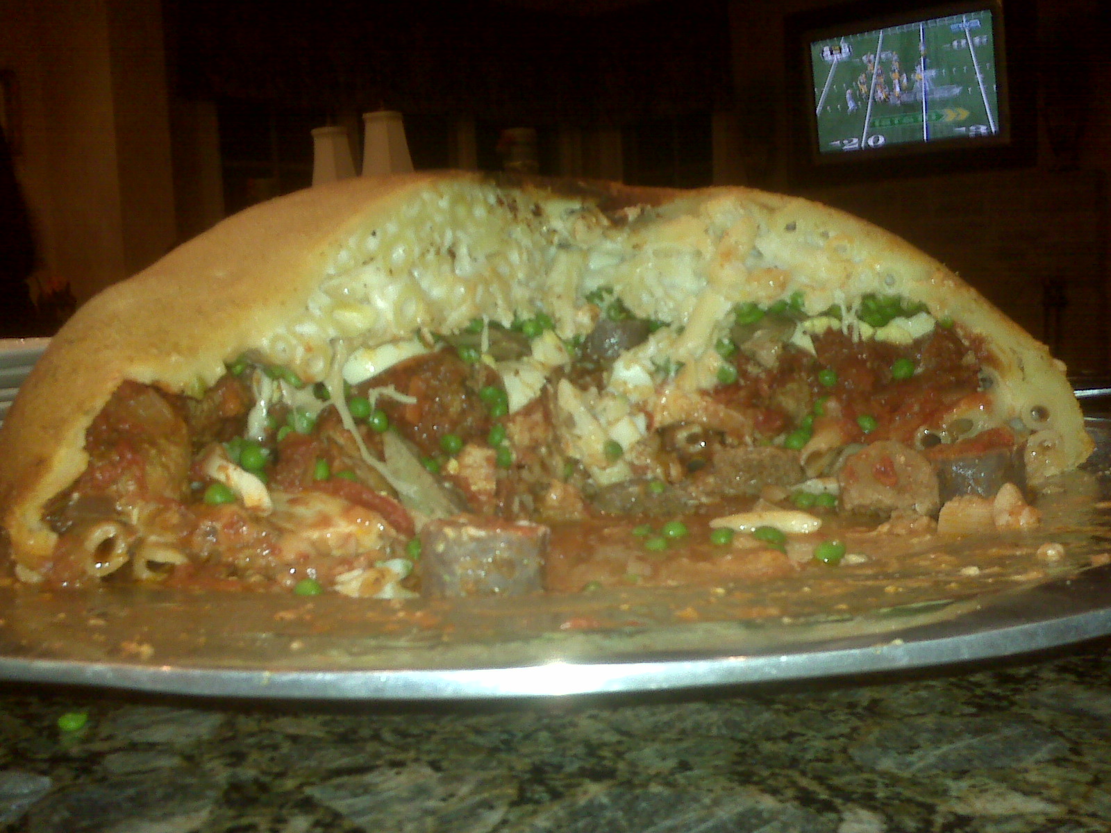 She writes" Success!! What a hit this dish was with my hungry super bowl guests! I used a pastry crust that included some sour cream and added a layer of pasta with besciamella sauce. It was a good thing that we had some strong and brave men around to flip the thing...I made it in a 10 qt stainless steel bowl and it must have weighed 20 pounds! Thank you! Mary Beidler
