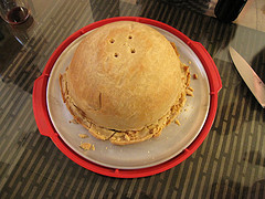 Make two or three 1 inch slits in the top crust to vent steam during the cooking process, place in the center of the pre-heated oven and bake for approximately 40 minutes. The pastry should be well browned, all the ingredients should be thouroughly heated, and the cheese melted.