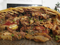 Place a layer of pasta in the bottom of the pastry shell, about 1 inch deep. Ladle about 1 Cup of the Ragω evenly over the pasta, then sprinkle half the peas over that. Arrange half the sausages, meatballs, chicken breasts, chicken livers, hard boiled eggs and mozzarella on top of the pasta, then sprinkle with freshly grated Parmigiano and freshly chopped Italian parsley.